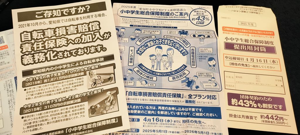 かなり遅くなってしまいましたが、学校で4月に配られた「小中学生総合保障制度」の紙についてずっと書きたかったので、書きます。