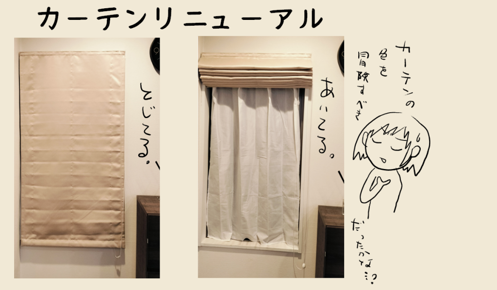 前は、窓枠内のロールカーテンの内側にレースのカーテンをつけていたのでうまく機能しなかったのですが、今回は、窓枠を覆うように遮光素材のプレーンシェードカーテンを取り付けました。